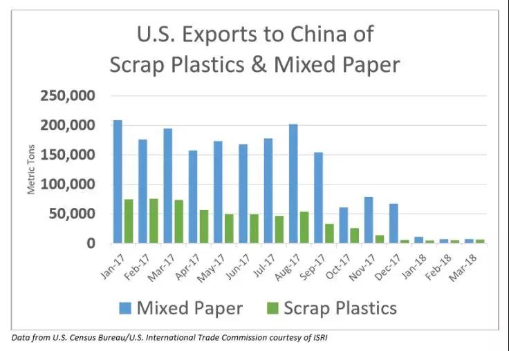 根據(jù)美國廢棄金屬工業(yè)協(xié)會提供的數(shù)據(jù),僅2016年一年,美國就向中國出口了高達(dá)143萬噸的塑料廢品和1320萬噸的紙質(zhì)廢品,總價值56億美元。
