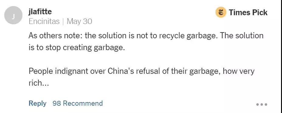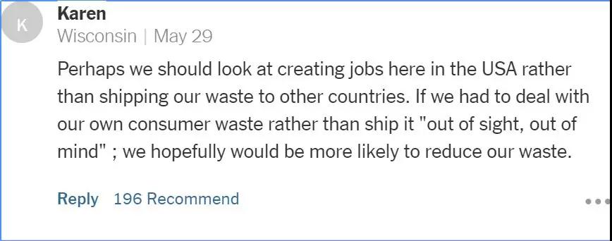 “我們應(yīng)該致力于在美國國內(nèi)創(chuàng)造更多的垃圾處理相關(guān)的就業(yè)崗位,而不是把垃圾轉(zhuǎn)運(yùn)到其他國家。如果我們能意識到自行處理垃圾是件多么困難的事情的話,我們的浪費(fèi)也就自然而然減少了?!?/p>