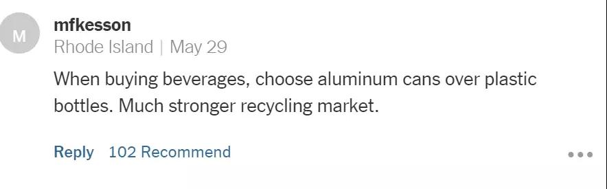 “當(dāng)我們買飲料時,應(yīng)該盡量買那些鋁制罐裝的而不是塑料的。鋁材質(zhì)有著更強(qiáng)大的回收市場?!?/p>