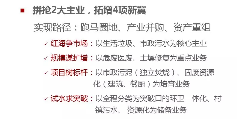 抓住環(huán)保行業(yè)持續(xù)增長的趨勢和新興業(yè)務(wù)爆發(fā)式增長的契機(jī),繼續(xù)以“2+4”業(yè)務(wù)為重點(diǎn),通過實(shí)施主動(dòng)擴(kuò)張戰(zhàn)略,快速提升市場規(guī)模,確保三年發(fā)展成為“3+3”并力爭向“4+2”業(yè)務(wù)格局轉(zhuǎn)型,并探索業(yè)務(wù)的延伸。