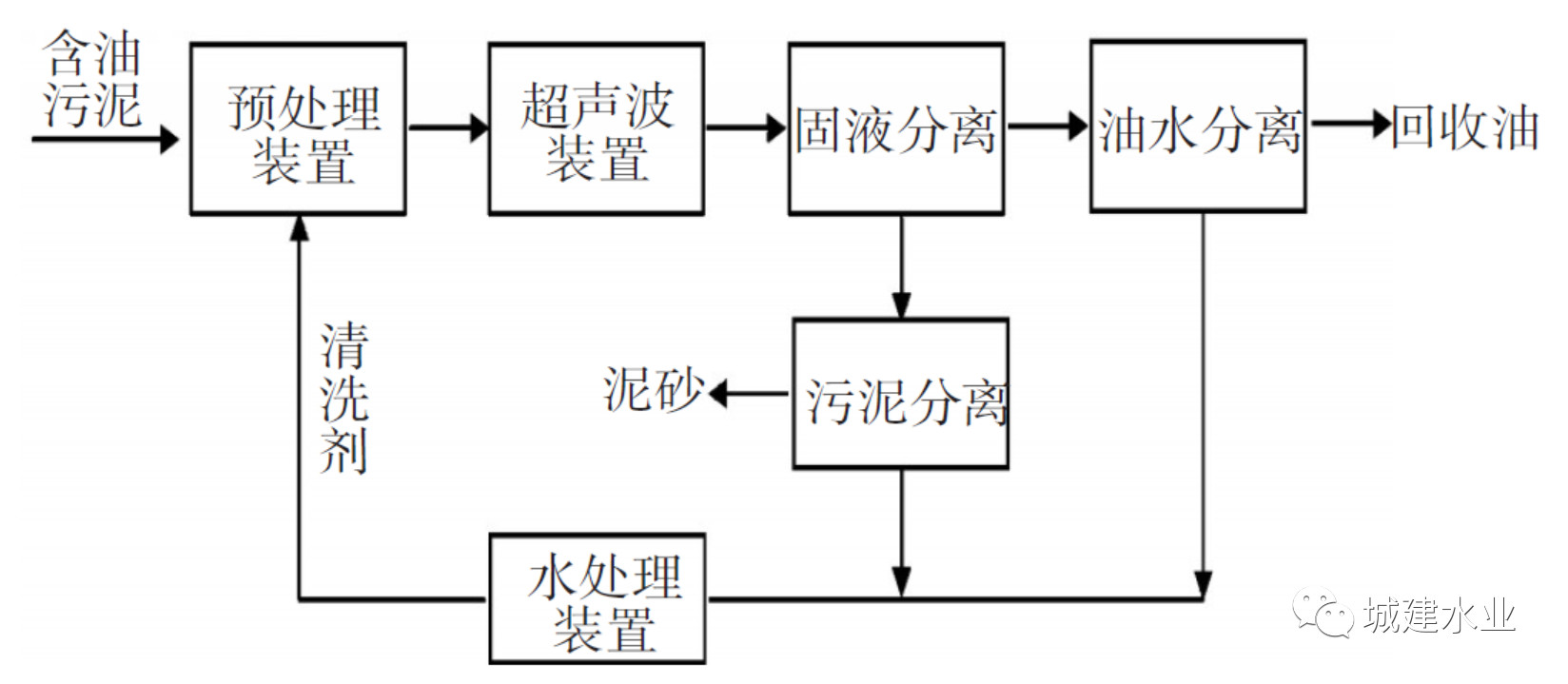 超聲處理技術(shù)是通過聲場(chǎng)的機(jī)械振動(dòng)、空化效應(yīng)及熱作用來破壞含油污泥的結(jié)構(gòu),降低污泥中原油的黏度,減小原油與無機(jī)固體間的黏附作用,從而使含油污泥中的油和泥砂分離。其工藝流程如圖3.5所示:①清洗劑預(yù)處理含油污泥;②超聲分離油泥,使原油與固體顆粒分離;③旋液分離器分離油水和泥砂,泥砂通過離心機(jī)脫水,油水經(jīng)分離器分離出油。