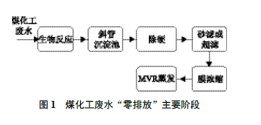 1零排放常見工藝隨著的收緊,國家對(duì)已建和新建的煤化工項(xiàng)目要求廢水“零排放”。雖然不同煤化工工藝產(chǎn)生的廢水性質(zhì)有所差異,但傳統(tǒng)處理煤化工廢水的工藝大多包括生物活性處理、化學(xué)沉淀、懸浮物過濾、膜濃縮產(chǎn)水回用和蒸發(fā)固化等。圖1 為煤化工廢水“零排放”主要階段示意。膜濃縮和蒸發(fā)結(jié)晶工藝對(duì)進(jìn)水硬度有嚴(yán)格要求,...