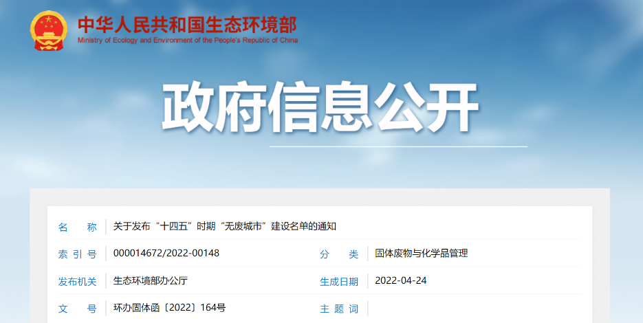 關于發(fā)布“十四五”時期“無廢城市”建設名單的通知各省、自治區(qū)、直轄市生態(tài)環(huán)境廳(局): 為落實《中共中央 國務院關于深入打好污染防治攻堅戰(zhàn)的意見》和《“十四五”時期“無廢城市”建設工作方案》(以下簡稱《工作方案》),我部會同有關部門,根據各省份推薦情況,綜合考慮城市基礎條件、工作積極性和國家相關重大...