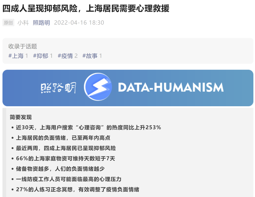 據(jù)心理領(lǐng)域的公眾號(hào)“照路明”,說(shuō)現(xiàn)在上海疫情嚴(yán)重,大家隔離短的已經(jīng)半個(gè)多月,長(zhǎng)的一個(gè)多月,近四成上海人呈現(xiàn)抑郁風(fēng)險(xiǎn),需要救援。 圖片來(lái)自網(wǎng)絡(luò) 其實(shí),這些心理救援是非常重要的。每個(gè)人碰到這種百年不遇的疫情和居家隔離,都會(huì)出現(xiàn)或多或少的心理問(wèn)題。如果能打通心理咨詢(xún)熱線(xiàn)最好,可以聽(tīng)聽(tīng)專(zhuān)業(yè)人士的輔導(dǎo)。如果搶...